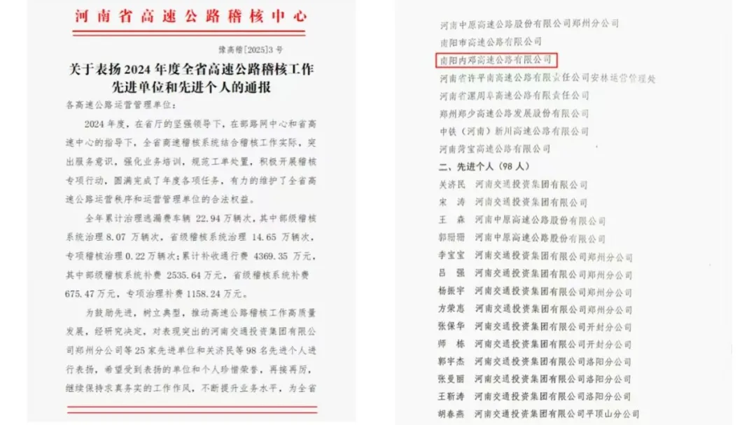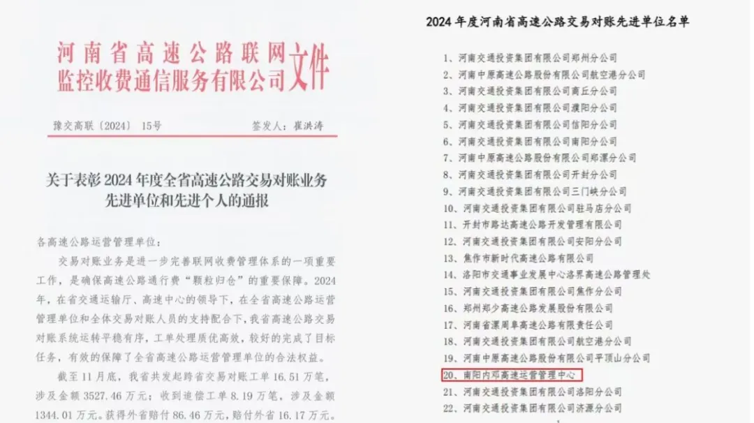 喜报!内邓高速获评2024年度河南省高速公路“交易对账先进单位”和“稽核工作先进单位