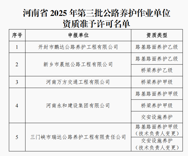 近日,河南省交通运输厅发布了《关于河南省2025年第三批公路养护作业单位资质许可决定的公告》(豫交建管许〔2025〕136号),南阳交投集团下属河南万方交通工程有限公司在已获得路基路面养护甲级资质、交通安全设施养护资质的基础上,新增了桥梁养护甲级资质,为国内公路养护资质的最高等级,交投万方公司也成为南阳市首家拥有三项甲级资质的企业。